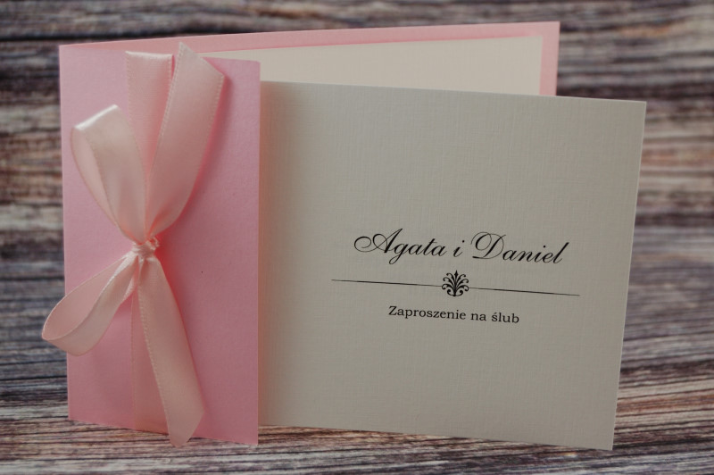 Okładkę zaproszenia stanowi kolorowy papier perłowy otoczony piękną wstążką zakończoną kokardką,