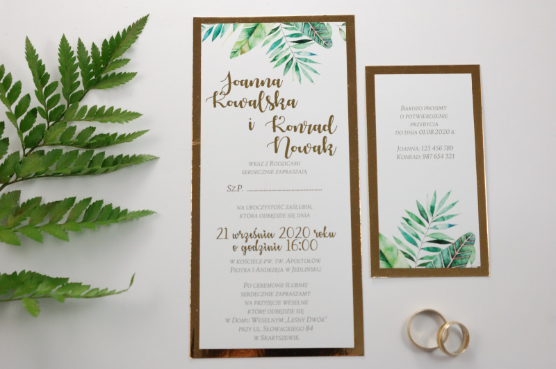 Przód zaproszenia ozdabia kolorowy nadruk pastelowych zielonych listków, złocone imiona młodych oraz data ślubu. Delikatny złoty sznureczek oplatający zaproszenia
